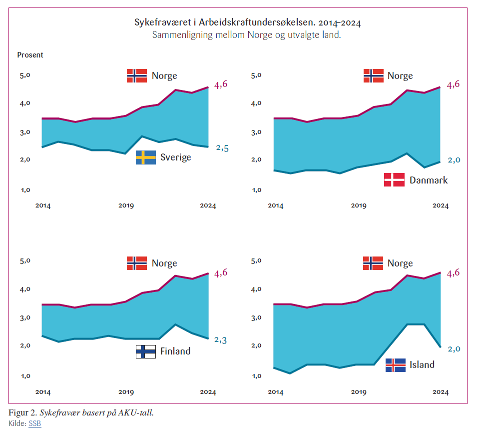 Dersom vi bruker tall fra arbeidskraftsundersøkelsen (AKU) for å måle sykefraværet, kommer Norge dårlig ut sammenlignet med våre naboland – se Figur 2. Selv om AKU-statistikken benytter samme metodikk på tvers av land, påvirker strukturelle forhold tallene. For eksempel vil sykefraværet være høyere dersom sysselsettingen blant utsatte grupper er høy, eller dersom et sterkt arbeidsvern gjør at utsatte grupper står lenger i jobb. Selv om dette kan forklare noe av det høye sykefraværet, fremstår likevel utviklingen de siste årene bekymringsfull.