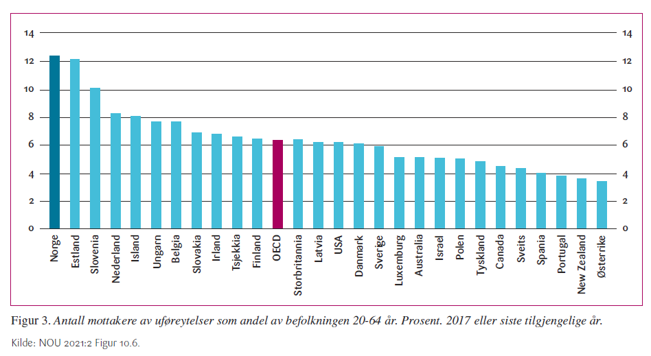 Dersom man sammenligner andelen mottakere av uføretrygd på tvers av land kommer Norge også dårlig ut – se Figur 3. Komposisjonen av arbeidsstyrken påvirker ikke disse andelene, da uføretrygd måles relativt til befolkningen totalt. Internasjonale sammenlikninger er likevel utfordrende også her, da trygdesystemene i ulike land er innrettet på forskjellige måter. Mennesker som i Norge ville vært uføretrygdet kan være mottakere av andre typer trygd i andre land, eller risikere å falle utenfor det offentlige velferdssystemet (Pedersen, Grødem og Wagner 2019).