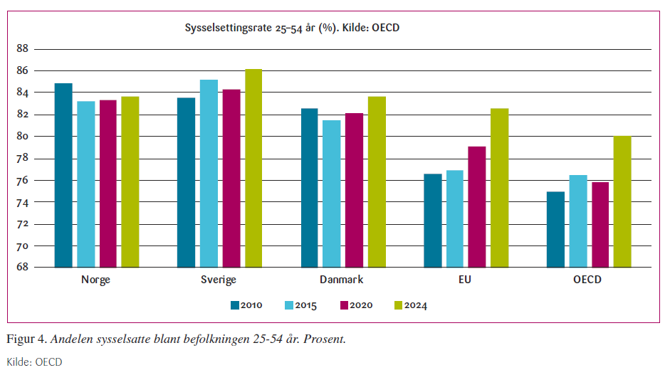 Gitt utfordringene ved å sammenligne andelen trygdemottakere på tvers av land kan man i stedet se til andelen av befolkningen som er i jobb. Her kommer Norge bedre ut – se Figur 4. Norge har en betydelig høyere sysselsettingsrate enn snittet i EU og OECD. I 2010 var sysselsettingsraten i Norge også høyere enn i Sverige og Danmark, men dette er ikke lenger tilfellet. Mens sysselsettingsraten har falt over de siste 15 årene i Norge, har den steget i Sverige og Danmark.
